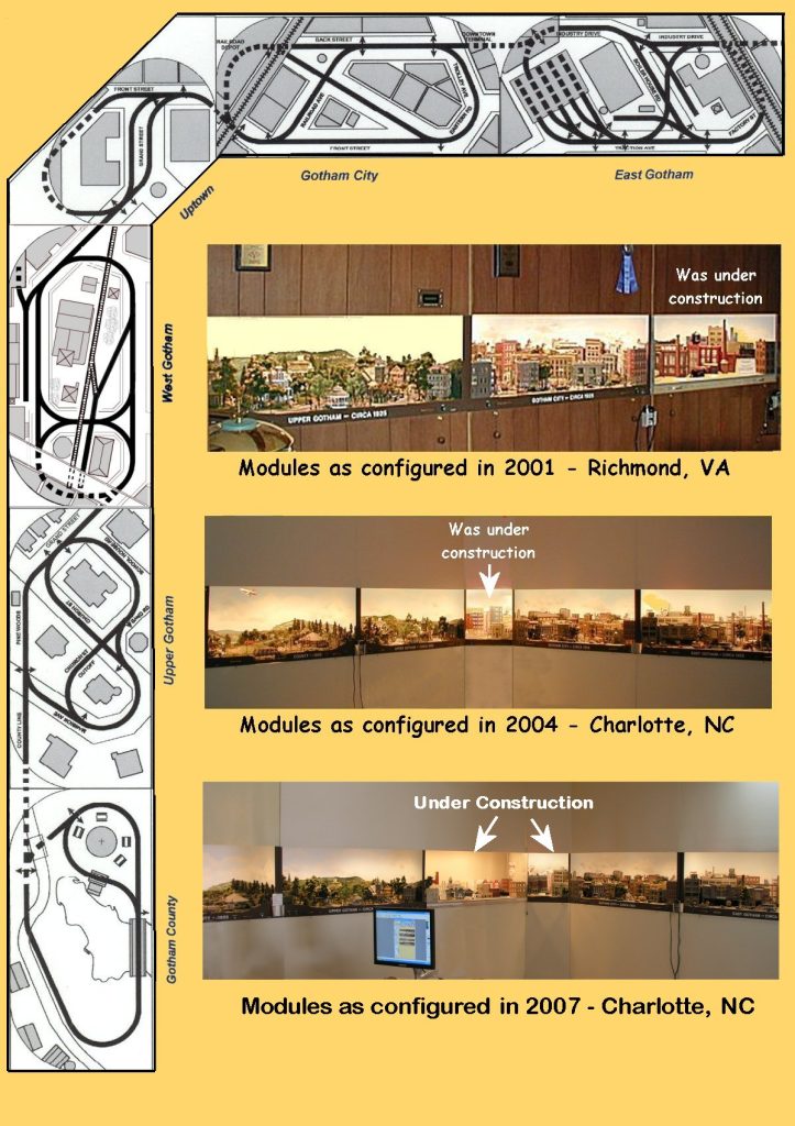• Gotham City represents a small city with moderately large (3 – 4 story) city buildings served by the City Line of the T&CT Co. The module is currently populated with 151 people, 25 cats, dogs, horses and pigeons, 28 cars, wagons and trucks, and 18 modeled buildings, most with lighting and some interior detailing.